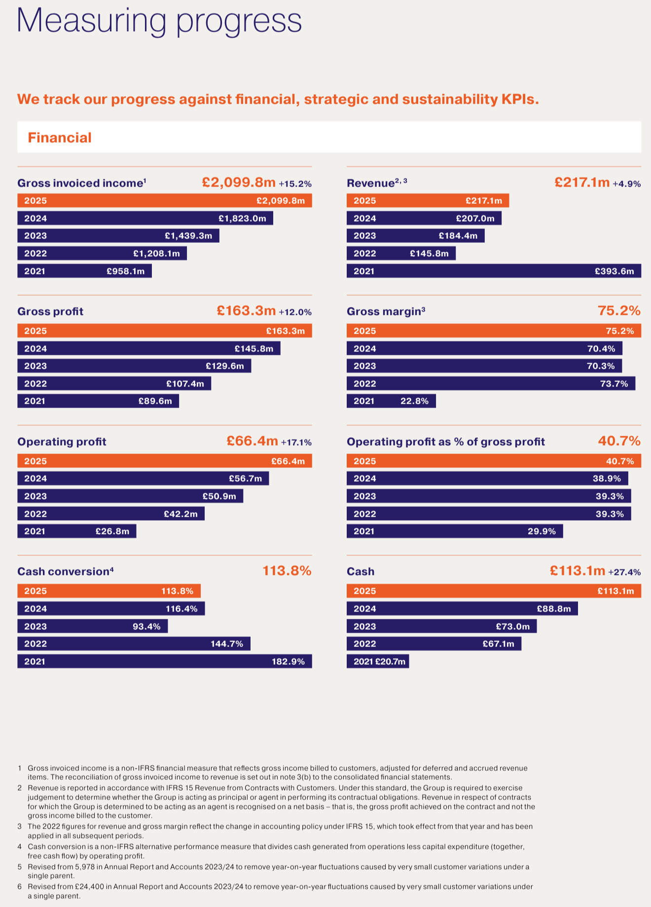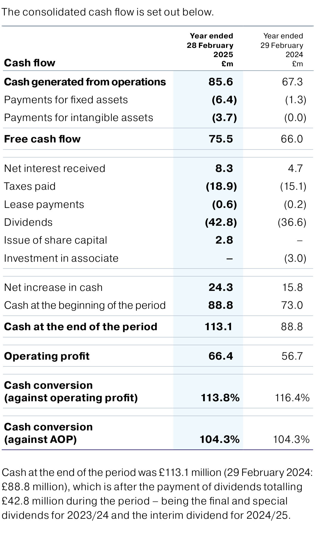 Relentless Free Cash Flow Generation (Score: 5/5): Free Cash Flow (FCF) has experienced substantial growth, reaching £49.86 million over the five-year period from FY2021 to FY2025, with a compound annual growth rate (CAGR) of 37.4%. Notably, their cash conversion rate stands at an impressive 112.6%, consistently surpassing their 100% target. This indicates a high proportion of their earnings being directly converted into cash, which can be reinvested or distributed to shareholders.