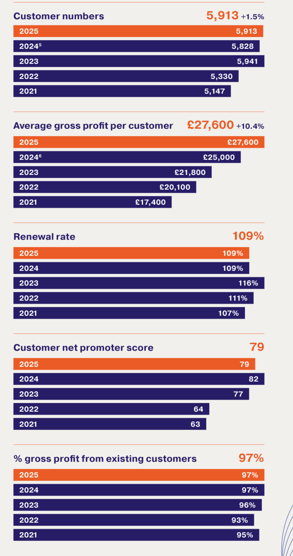 Genuine Organic Growth (≥5–9%) (Score: 4/5): While recent headwinds have temporarily impacted reported revenue, Gross Profit (a more accurate measure for a VAR) has grown at a robust 16.1% CAGR from FY2021 to FY2025. This is well above the 5-9% criterion, driven by high customer renewal rates (109% in 2024/25) and new customer acquisition. Their modest 4% market share in a growing market offers substantial runway.