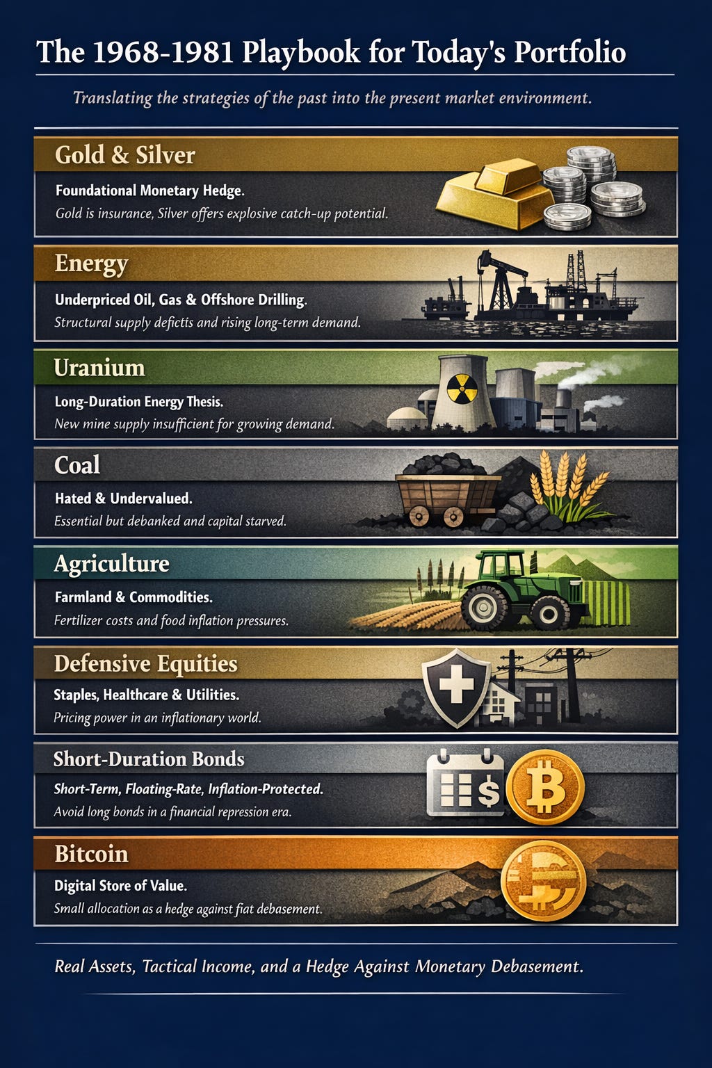 Short-duration fixed income rather than long bonds. The destruction of long-duration bond holders was one of the defining features of the 1968-1981 period. Long bonds in a financial repression regime are not a safe haven. They are slow-motion wealth destruction dressed up in the language of safety.