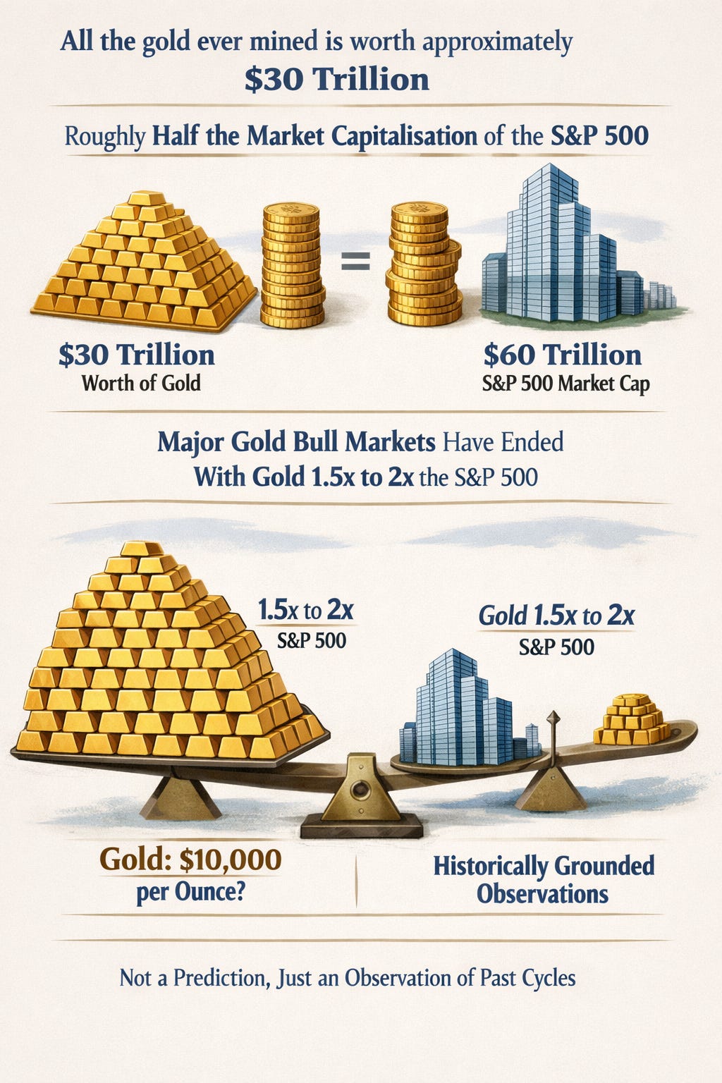 Adam Rosenwag offers the most intellectually rigorous framework for understanding where gold goes over the next decade. All the gold ever mined in human history is worth approximately $30 trillion at current prices. Roughly half the market capitalisation of the S&P 500. Historically, major gold bull markets have ended with gold’s total value somewhere between one and a half and two times the S&P 500. On a flat S&P, that implies a gold price of around $10,000 per ounce.