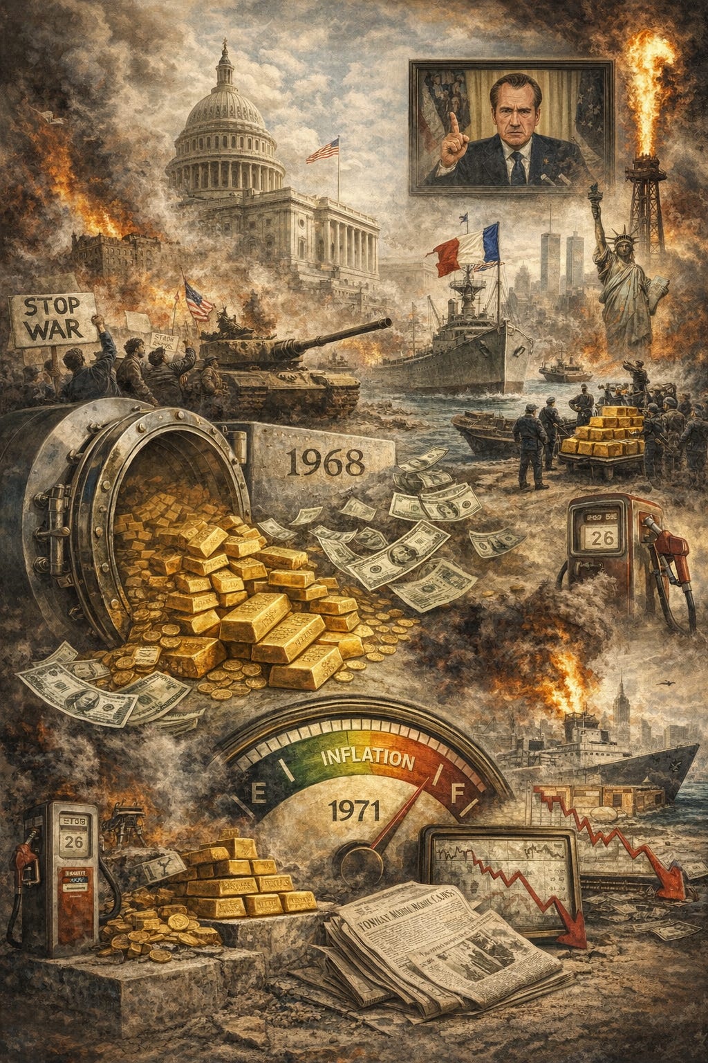 Lyndon Johnson’s Great Society was in full spending mode. Medicare, Medicaid, anti-poverty programmes, education spending. All of it financed not by taxation but by debt and monetary expansion, while simultaneously funding a ground war in Vietnam that was consuming billions with no end in sight. The Bretton Woods system, which had anchored the global economy since 1944 by fixing the dollar to gold at $35 an ounce, was quietly breaking under the strain. Too many dollars had been printed. Too little gold remained to back them. France, ever alert to American financial sleight of hand, was already sending ships to New York to redeem its dollar reserves for physical bullion.