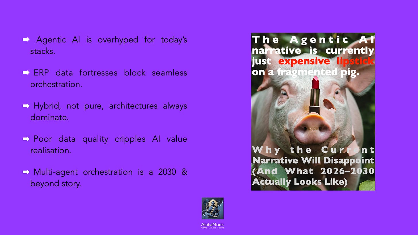 The reality is: Agentic AI will work exceptionally well in narrow, well-defined domains (vertical SaaS, in-platform agents, managed services). Multi-platform enterprise orchestration will remain niche, expensive, and risky.